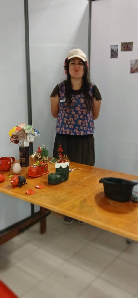 Régine, originaire de Chauffailles, est une artiste complète, elle a fait également partie de l’Odyssée de l’Espoir à Roanne où elle a rencontré Nicolas. Ensemble ils ont eu l’idée de se regrouper pour créer une association artistique. Régine crée des objets en matières recyclées, mais grâce à son costume de clown, amuse petits et grands avec ses tours de magie. Elle chante, elle tape sur son djembé qui n’est pas en bambou quoique ? Elle chante également et fait du théâtre.
